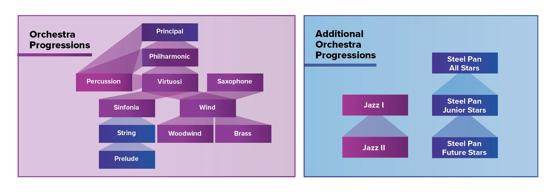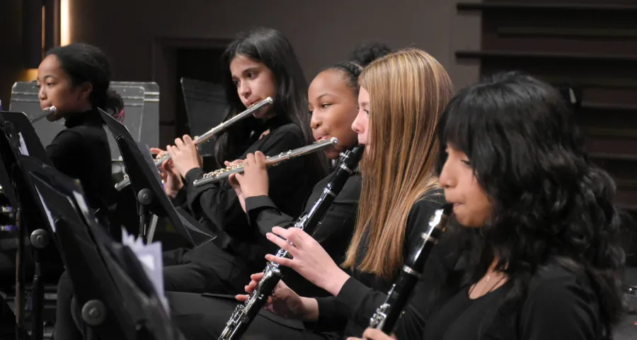 Separate Woodwind & Brass Orchestras provide fundamental ensemble experience to young musicians. Students learn what it’s like to be part of their section and prepare to play in bigger ensembles. They learn key skills like rhythm, intonation, sound production, breath control, and key signatures.